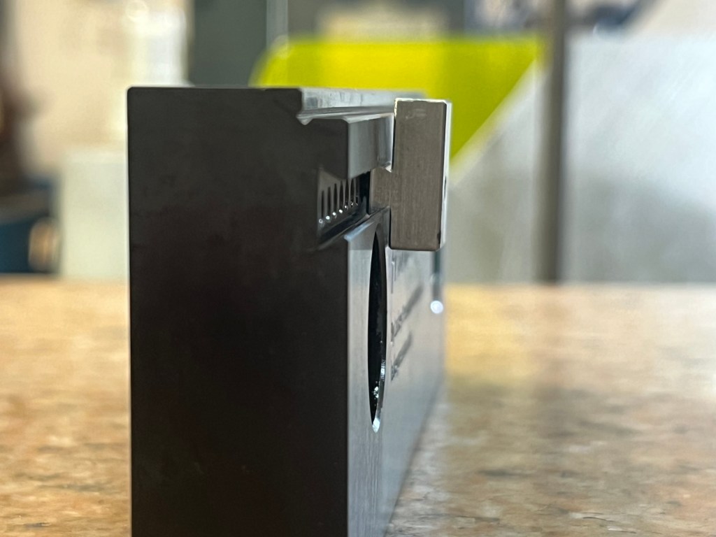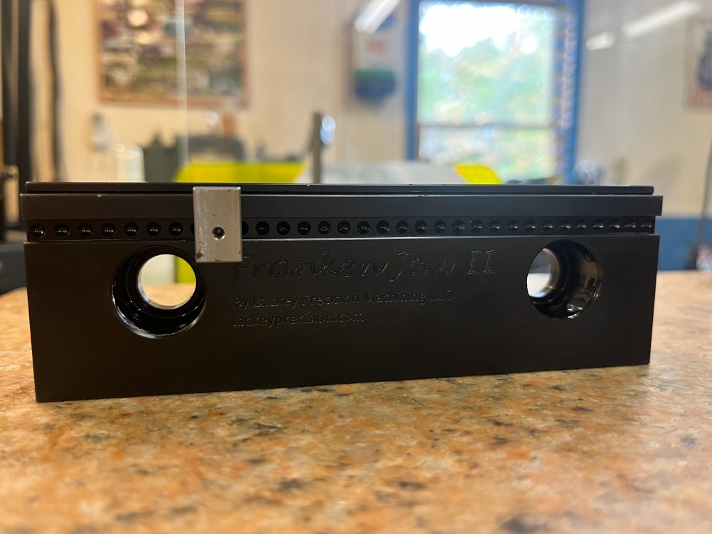 Franken Jaw II are case hardened jaws for 6 inch Kurt Vises. They are case hardened to 56 Rc .012 deep with a .10″ deep by .15″ wide step and a built in adjustable stop that will always be below the top of the vise jaw. The stop uses a dovetail and an M3 set screw to create a quick adjustment and a positive stop for your work piece. $105 per set, free shipping to continental United States